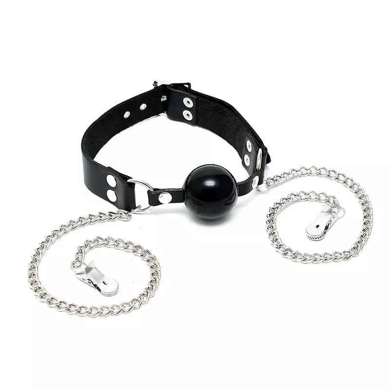 Bâillon boule avec pinces à seins : un ball gag intégrant une paire de pinces à seins afin de forcer votre partenaire à souffrir en silence…