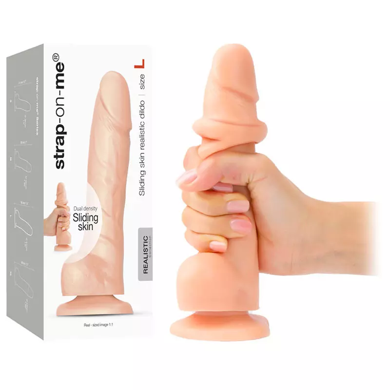 Voici le tout nouveau dildo Sliding Skin de la marque strap-on-me. Ce godemichet très réaliste dispose d’un gland et d’un scrotum moelleux ainsi que des veines apparentes afin de vous procurer le sentiment d’avoir entre les mains un véritable pénis en érection.