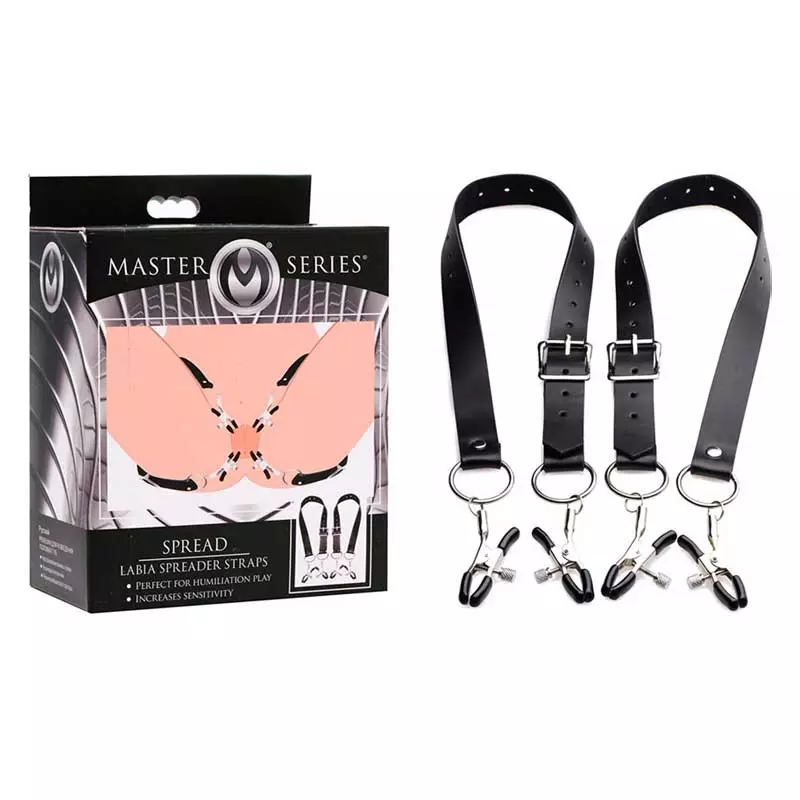 Voici Spread proposé par Master Serie, des sangles qui se placent autour des cuisses et qui viendront pincer, avec une pression ajustable, les grandes lèvres vaginales.