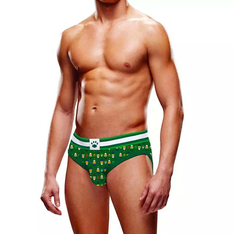 Ce slip sexy de couleur verte est décoré avec de magnifiques motifs de sapins de Noël et des logos de la marque Prowler.